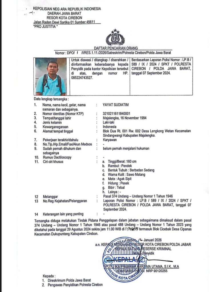Setelah penyelidikan lanjutan, pihak kepolisian akhirnya menetapkan Yayat Sudiatim (YS), 41 tahun, sebagai tersangka dalam kasus dugaan penggelapan dalam jabatan. Surat resmi penetapan DPO ini dituangkan oleh Kasatreskrim Polresta Cirebon, Kompol I Putu Ika Prabawa Kartima Utama SIK MA, tertanggal 12 Januari 2026 dengan nomor surat DPO/1/1/RES.1.11./2026/Satreskrim/Polresta Cirebon/Polda Jabar.